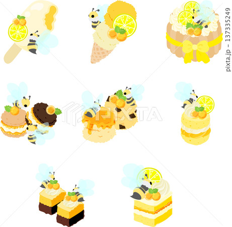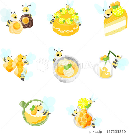 まんまる蜂蜜ゼリーと、マシュマロのミツバチを飾った甘〜いスイーツのイラストセットです。