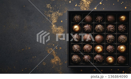 黒い正方形の箱に美しく並べられた金粉とナッツの高級アソートチョコレート