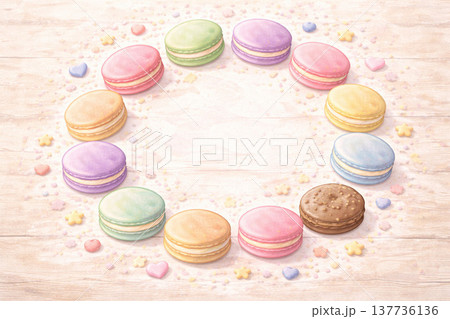 スイーツシリーズ:マカロンが放射状に広がる俯瞰背景