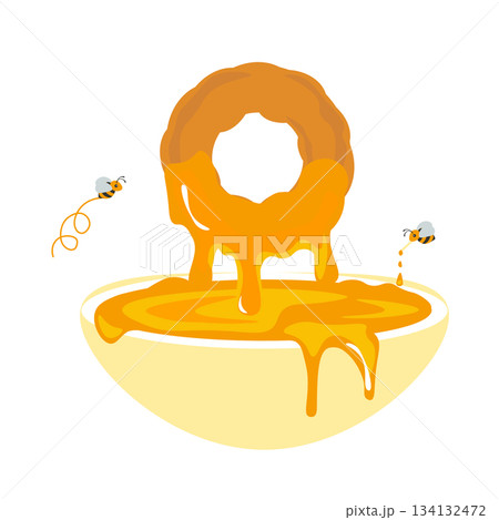 ミツバチと、蜂蜜ソースにたっぷりとつけたドーナツのイラスト