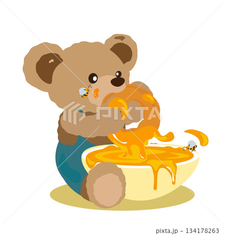 ミツバチと一緒に蜂蜜を付けてドーナツを食べるクマのぬいぐるみのイラスト
