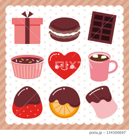 手描きのチョコレートスイーツとストライプ柄の背景イラスト