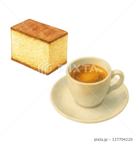 カステラとコーヒーカップの水彩イラスト カフェスイーツ素材