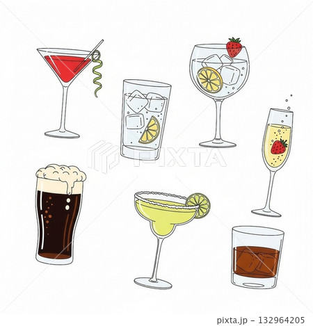 カクテルのアイコンイラストセット 飲み物 アルコール 線画 カラフル 乾杯 シンプル