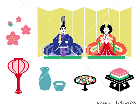 ひな祭りの食卓を彩るちらし寿司や菱餅など伝統的な行事食のアイコンセット