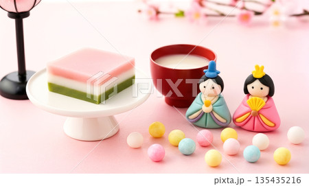 ひな祭りの和菓子セット 菱餅・ひなあられ・甘酒 桃の節句のお祝い 春のイメージ 背景素材