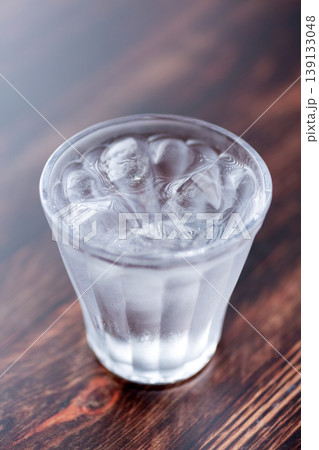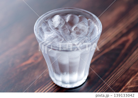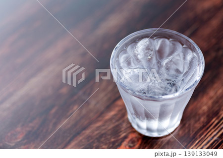 光を反射するグラスとレモンスライス入りの冷たい氷水