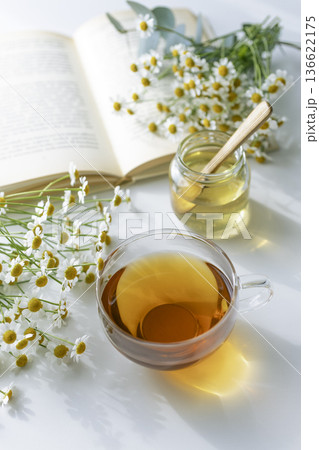 俯瞰で見るアールグレイの紅茶とはちみつ、マトリカリアとユーカリのある読書時間