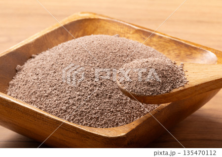 スプーンに載せた砂糖入りのココアの粉のクローズアップ