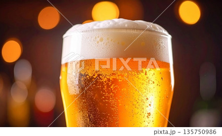 100% 10 A1950 泡が立つ冷たいビールジョッキをクローズアップで撮影した爽快感あふれる