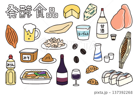 ビールや味噌などのさまざまな発酵食品のイラストセット