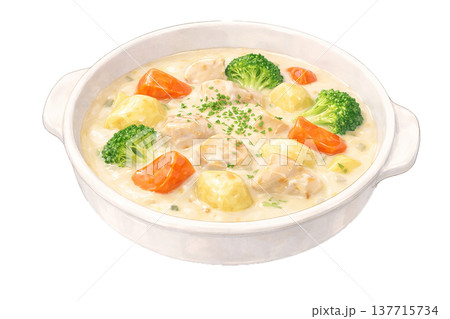 水彩風イラストのクリームシチュー 野菜と鶏肉入り 冬の洋食素材