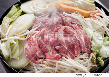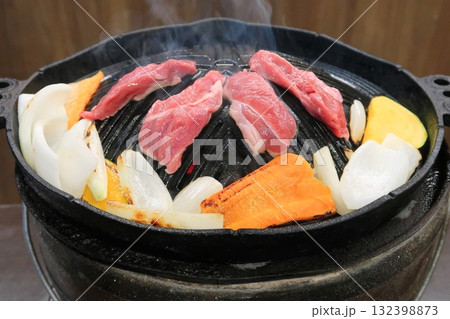 ラム肉を使ったバーベキュー料理のジンギスカン。鉄鍋でラム肉と野菜を焼いている。。
