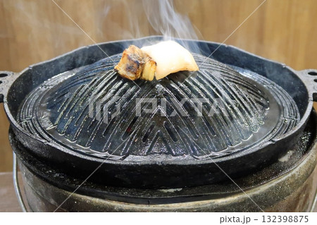 ラム肉を使ったバーベキュー料理のジンギスカン。ラム肉を焼くために脂を鉄鍋に塗っている。