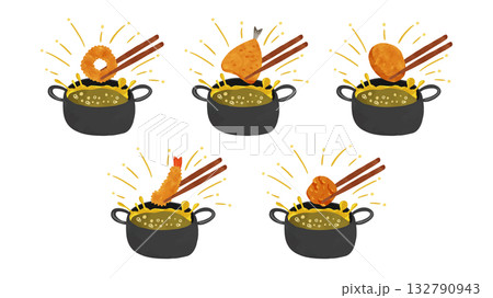 揚げ物鍋とフライ天ぷらセット 水彩風手描きベクターイラスト