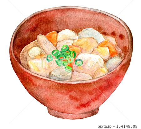 具だくさん豚汁の水彩風イラスト(大根・にんじん・豆腐・こんにゃく入り)