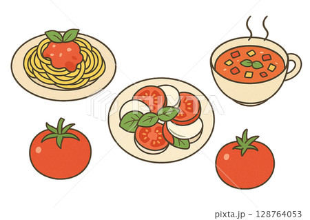 ドレッシングをかけたトマトときゅうりのグリーンサラダ・水彩イラスト素材