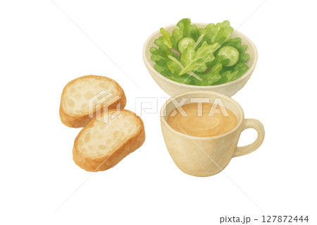 トーストとブラックコーヒーとグリーンサラダのヘルシーモーニング(水彩イラスト)