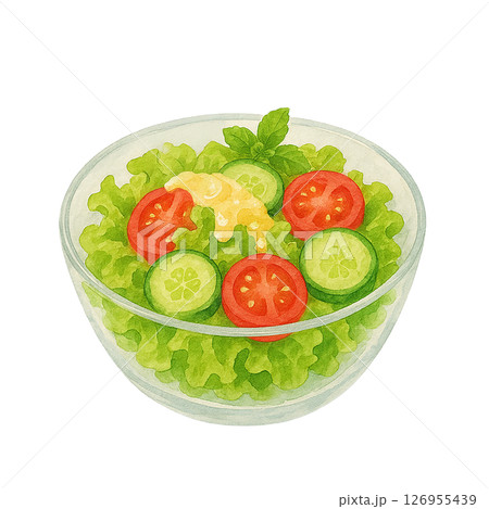 ガラスボウルのミックスサラダの水彩風イラスト(野菜・健康)