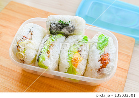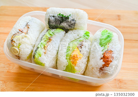 大きなおにぎりと卵焼きや唐揚げなど彩り豊かなお弁当を並べた家庭的で親しみやすいランチシーンの写真素材