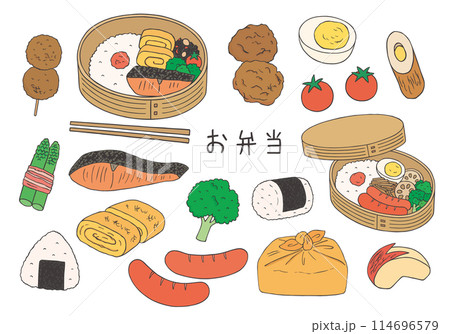 曲げわっぱ弁当箱と、弁当のおかずイラストセット(カラー/主線なし)