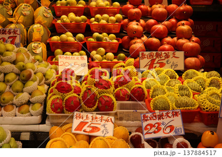 青空市場で売らるカキなどの果物。富有柿だが、中国産。ほとんどが輸入品。