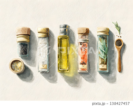 塩やオイル ハーブのガラスボトル 水彩 手描き イラスト ミニマル シンプル