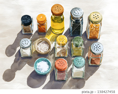 塩 コショウ ペッパー唐辛子が入った 様々な調味料ボトル 水彩 手描き