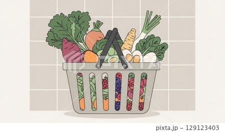 Shopping basket filled with fresh organic vegetables and fruits on beige tiled kitchen counter background including leafy greens carrots parsnips eggs and colorful produce