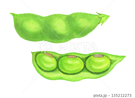 美味しそうで新鮮なグリーンピースの手描き水彩イラスト