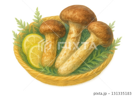 背景が白い落ち着いた色合いの松茸,まつたけ,マツタケ,の墨彩画