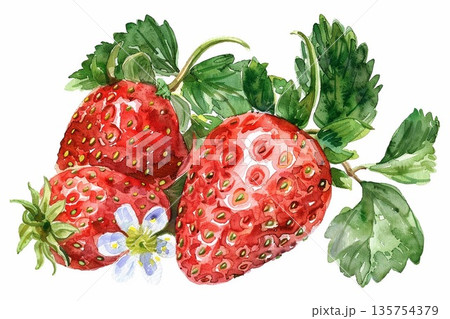 春の味覚である新鮮で真っ赤な完熟イチゴと白い花の水彩画イラスト