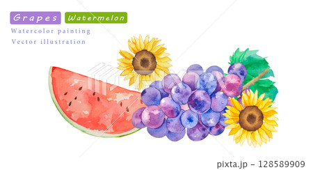 ひまわりとカットスイカの水彩ベクターイラストセット