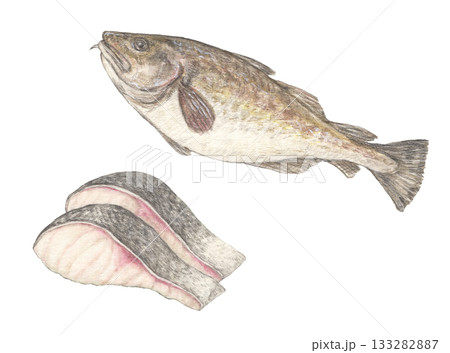 タラとタラの切り身 水彩色鉛筆魚イラスト