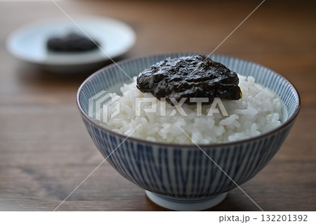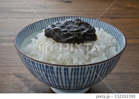 白背景のご飯にのせた海苔の佃煮