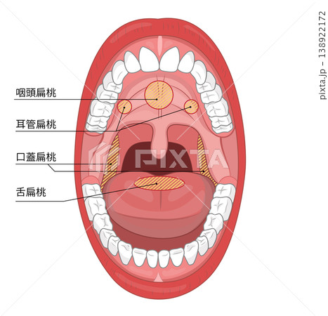成人が口を大きく開けた口腔内と口の中の扁桃を分かりやすく表したイラスト