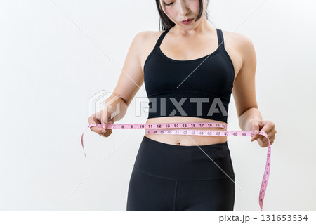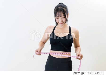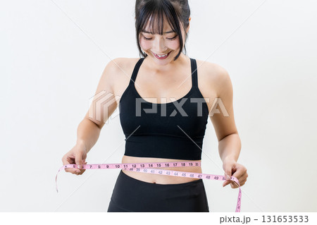 メジャーでウエストを測る女性 体を鍛えてるかっこいい女性 ダイエット 白バック トリミングアップ
