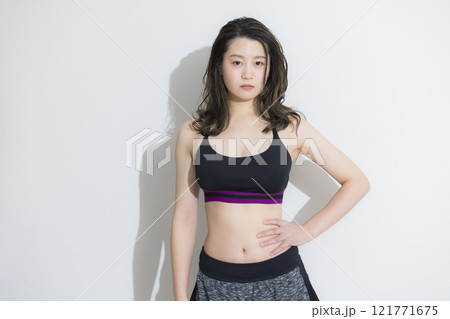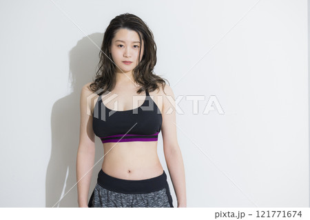プロテインシェイカーを持つ、体を鍛えてるかっこいい女性 筋トレ女子 白バック