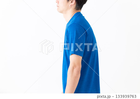 肩こりで肩を押さえる筋肉解剖図の男性の3Dイラスト 上半身後ろ姿