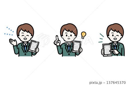 資料を説明する中年ビジネスマンのポーズセット(ノートパソコン・書類・タブレット)全身イラスト