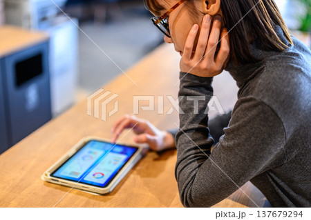 タブレットを見る若い日本人女性 :はっぴぃぽっぷ