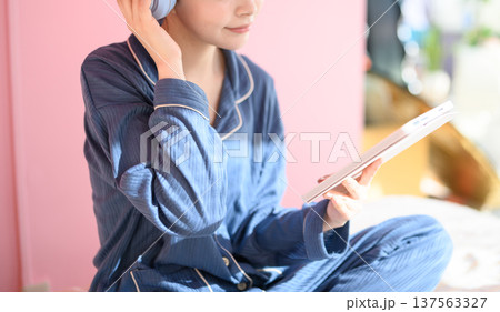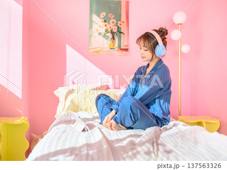 ベッドで音楽を聴く女性 :はっぴぃぽっぷ