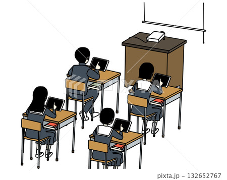 4人の男女の生徒がタブレットとプロジェクターで授業をしている絵
