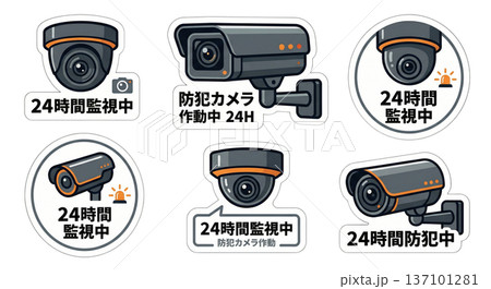 防犯カメラ監視中ステッカー 24時間監視セキュリティサイン 警告表示イラストセット