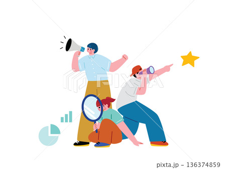虫眼鏡や双眼鏡を手に持つ家族・ビジネスチームのイラスト