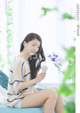 髪を乾かすパジャマ姿のおしゃれな日本人女性広告素材