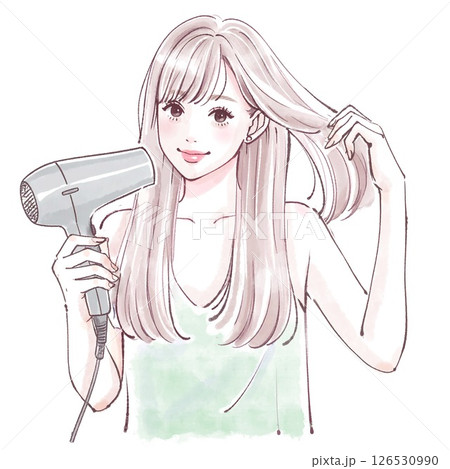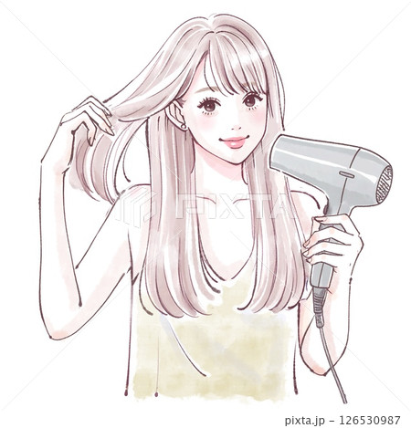 ドライヤーで髪を乾かすイラスト 女性 綺麗