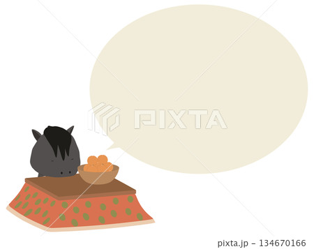 こたつでくつろぐ茶色い馬。吹き出し付き