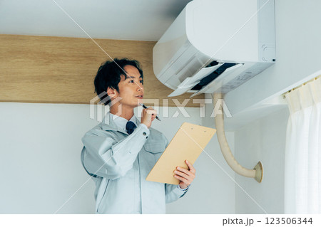 エアコンを点検する作業員