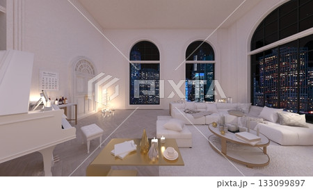黄金の灯りに包まれた優雅なピアノとレコード棚が並ぶ幻想的ラウンジ空間